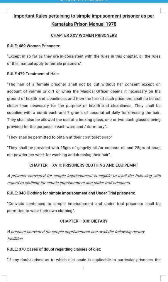 Karnataka Prisons Act 1963 2. Karnataka Prisoners Act 1963 3. Karnataka Prison Rules 1974 4. Karnataka Prison Manual 1978 5. Borstal School Act 1963 6. Of the Karnataka Prison Rules, 1974 and the Karnataka Prison Manual, 1978. Elaborate and separate questionnaires for inmates, officers and non-official visitors were prepared in Kannada. The team started visiting the prisons.